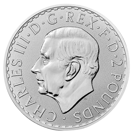 На лицевой стороне серебряной инвестиционной монеты "Британия" представлен портрет Елизаветы Второй. На этой же стороне, изображен первый портрет Его Величества Карла III, выполненный Мартином Дженнингсом (MJ), направленный влево, на фоне, украшенном гильошированным узором. Вокруг края монеты выгравированы слова "CHARLES III•D•G•REX•F•D" (Карл Третий, По Милости Божьей Король, Защитник Веры), а также указан номинал "2 POUNDS".