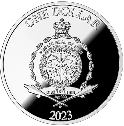 На аверсе монеты изображена Государственная печать Ниуэ и надписи: ONE DOLLAR — номинал, 2023 — год выпуска и Ag 999 — проба серебра.