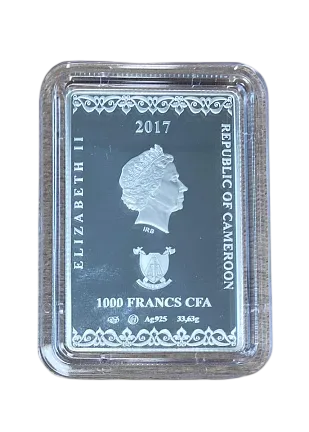 На аверсе отчеканен портрет Ее Величества королевы Великобритании Елизаветы II, выгравированы надписи — «ELIZABETH II», эмитент «REPUBLIC OF CAMEROON», номинал «1000 FRANCES CFA», год выпуска «2017» а также проба и вес.