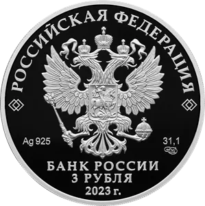 Аверс: рельефное изображение Государственного герба Российской Федерации, над ним вдоль канта – надпись полукругом «РОССИЙСКАЯ ФЕДЕРАЦИЯ», обрамленная с обеих сторон сдвоенными ромбами, под гербом слева – обозначения драгоценного металла и пробы сплава, справа – содержание химически чистого металла и товарный знак монетного двора, внизу в центре в три строки – надпись «БАНК РОССИИ», номинал монеты «3 РУБЛЯ», год выпуска «2023 г.».
