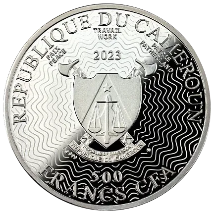 На аверсе монеты изображен герб Камеруна и надписи: «REPUBLIQUE DU CAMEROUN» — страна выпуска, «2023» — год выпуска и «500 FRANCS CFA» — номинал.