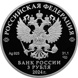 Аверс: рельефное изображение Государственного герба Российской Федерации, над ним вдоль канта – надпись полукругом «РОССИЙСКАЯ ФЕДЕРАЦИЯ», обрамленная с обеих сторон сдвоенными ромбами, под гербом слева – обозначения драгоценного металла и пробы сплава, справа – содержание химически чистого металла и товарный знак монетного двора, внизу в центре в три строки – надпись «БАНК РОССИИ», номинал монеты «3 РУБЛЯ», год выпуска «2024 г.».