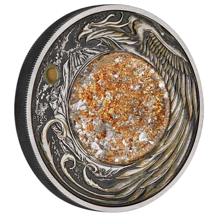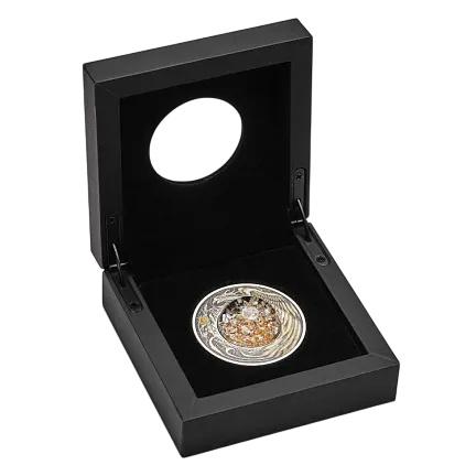 Монета представляет собой купол из плексигласа, содержащий частицы золота и серебра, взвешенные в прозрачной жидкости.