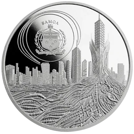 На аверсе изображен горизонт футуристического города с Государственной печатью Самоа.