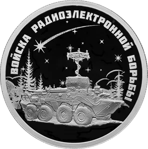 Реверс: рельефное изображение комплекса радиоэлектронной борьбы «Инфауна» на фоне выполненных в технике лазерного матирования изображений ночного неба и леса; вверху по окружности – рельефная надпись «ВОЙСКА РАДИОЭЛЕКТРОННОЙ БОРЬБЫ».