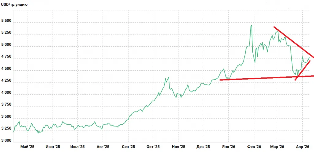С точки зрения технического анализа, ситуация на графиках золота как в долларах, так и в рублях приобретает крайне интересный характер. На дневных и недельных таймфреймах отчетливо прорисовывается классическая фигура консолидации тренда — «вымпел». После мощного импульсного движения вверх мы наблюдаем период бокового тренда в рамках нисходящего параллельного канала. В долларовом эквиваленте котировки сейчас тестируют нижнюю границу этой фигуры, и удержание текущих минимумов критически важно для сохранения долгосрочного бычьего потенциала.